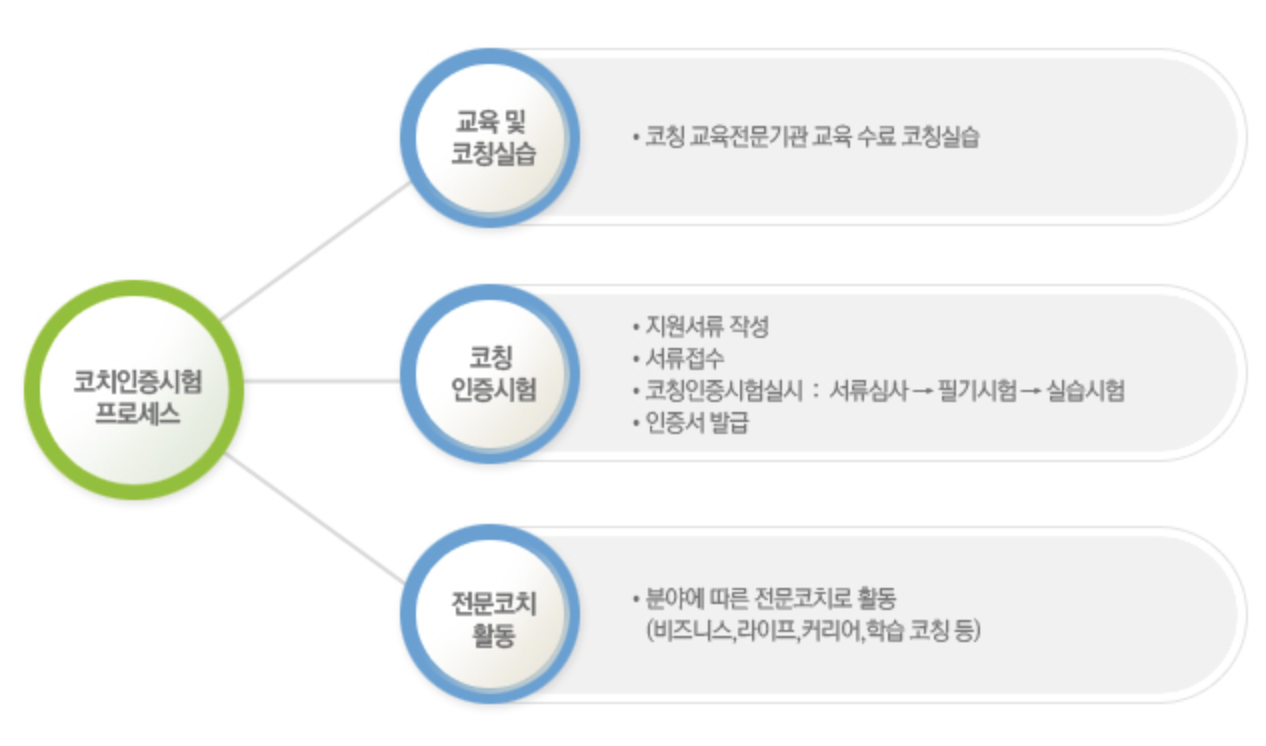 코치인증시험 프로세스로는 먼저, 코칭 교육전문기관을 통해 교육 수료 후 코칭실습을 진행합니다. 그리고 코칭인증시험 프로세스로는 지원서류 작성하고 서류를 접수 후 코칭인증시험을 실시하는데 순서는 서류심사 후 합격자에 한해 필기시험이 이뤄집니다. 필기시험은 서류심사 합격 발표 한 주의 수요일부터 금요일까지 3일동안 온라인으로 이뤄집니다. 필기시험 합격자는 짝수달 첫째주에 실기심사가 진행되는데 실기심사는 컨퍼런스콜을 통해 전화로 이뤄집니다. 실기심사까지 합격한 응시자는 한국코치협회 정회원 회원가입을 하면 인증서가 발급이 됩니다. 여기서 포인트는 모든 시험이 이뤄지고 난 다음 모든 과정을 합격하였다 하더라도 한국코치협회 정회원 등록을 하지 않는다면 모든 시험 절차에서 성취한 인증서는 발급되지 않습니다. 자격증을 취득하신 분은 전문코치로서 활동을 하면 되는데 이때, 코치님들이 브랜딩을 잘 하셔야 하는 것이 본인의 분야에 따라서 코치로서 활동을 하는데 비즈니스, 라이프, 커리어, 청소년, 스포츠 등 다양한 활동영역이 있지만, 코칭 교육만으로 해당 분야의 전문가로서 고객의 선택을 받기는 절대로 쉽지 않다는 것입니다.